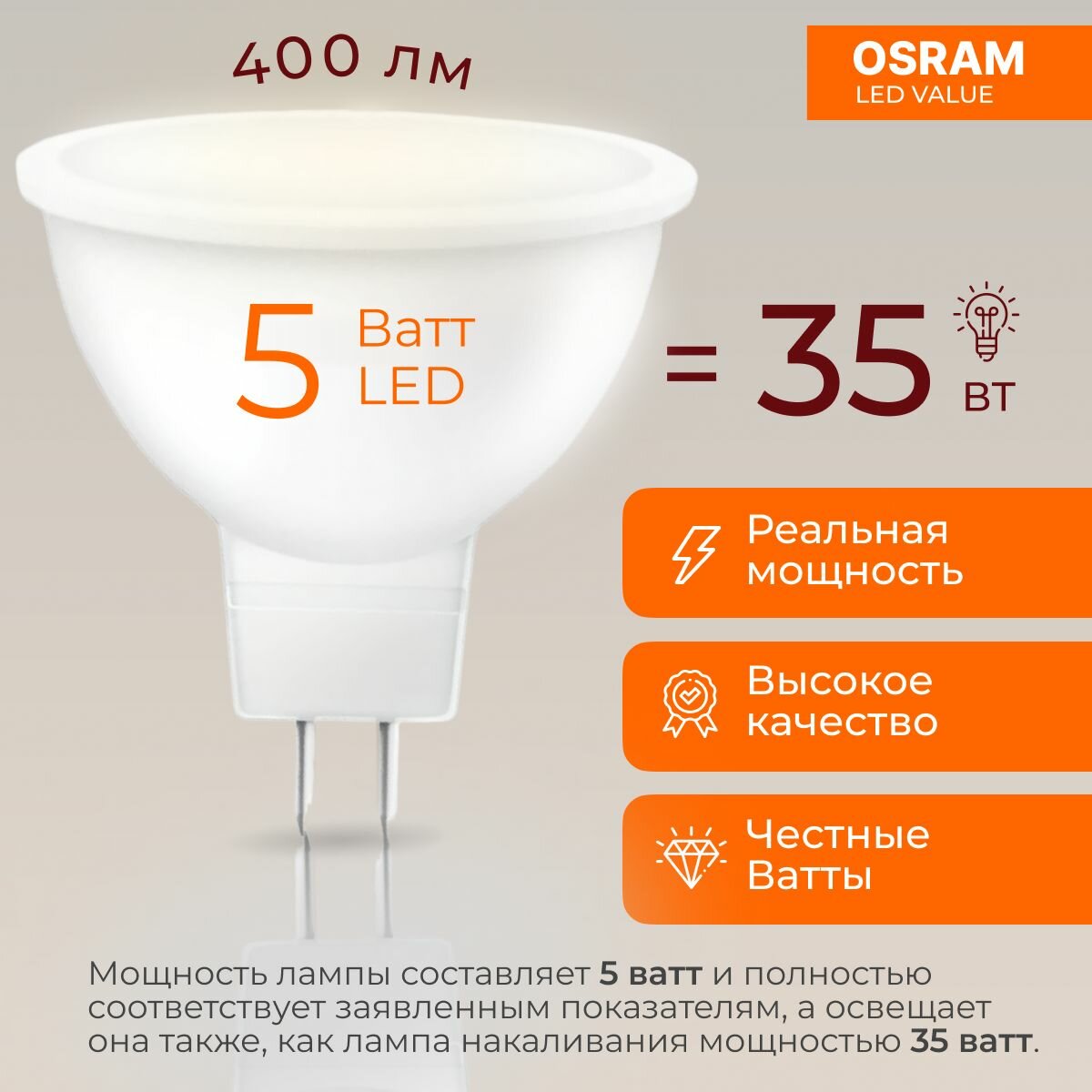 Отзывы на Светодиодная лампочка OSRAM GU5.3 5 Ватт 3000К теплый свет MR16 спот 220-240V LED 830, 5W, 400лм, набор 3шт