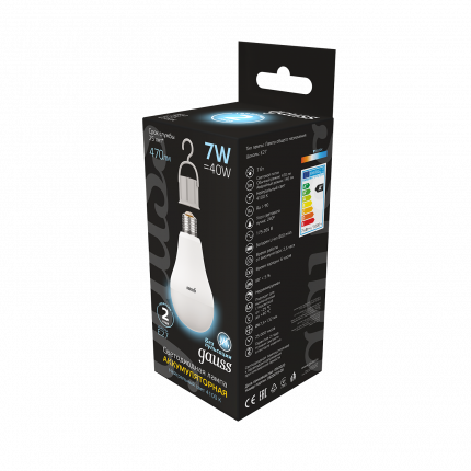 Лампа светодиодная Gauss E27 A60 7W 470L 4100K с литий-ионным аккумулятором