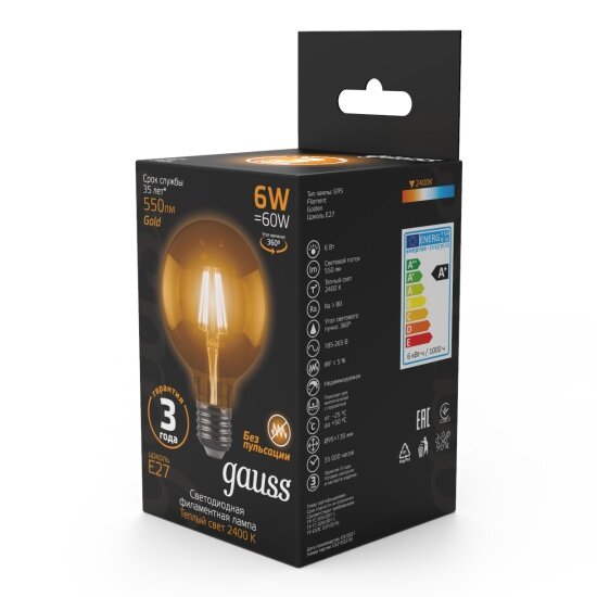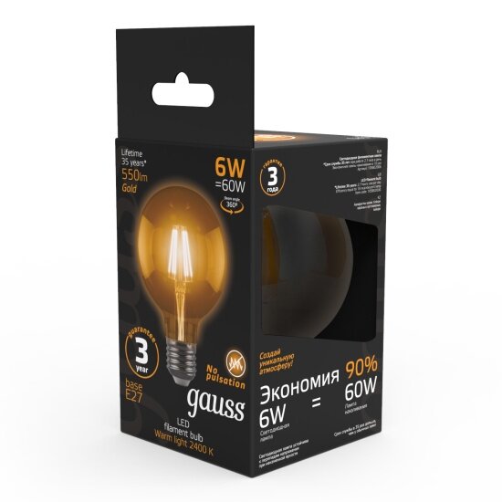 Светодиодная лампа Gauss LED Filament G95 E27 6W Golden 2400K информация: