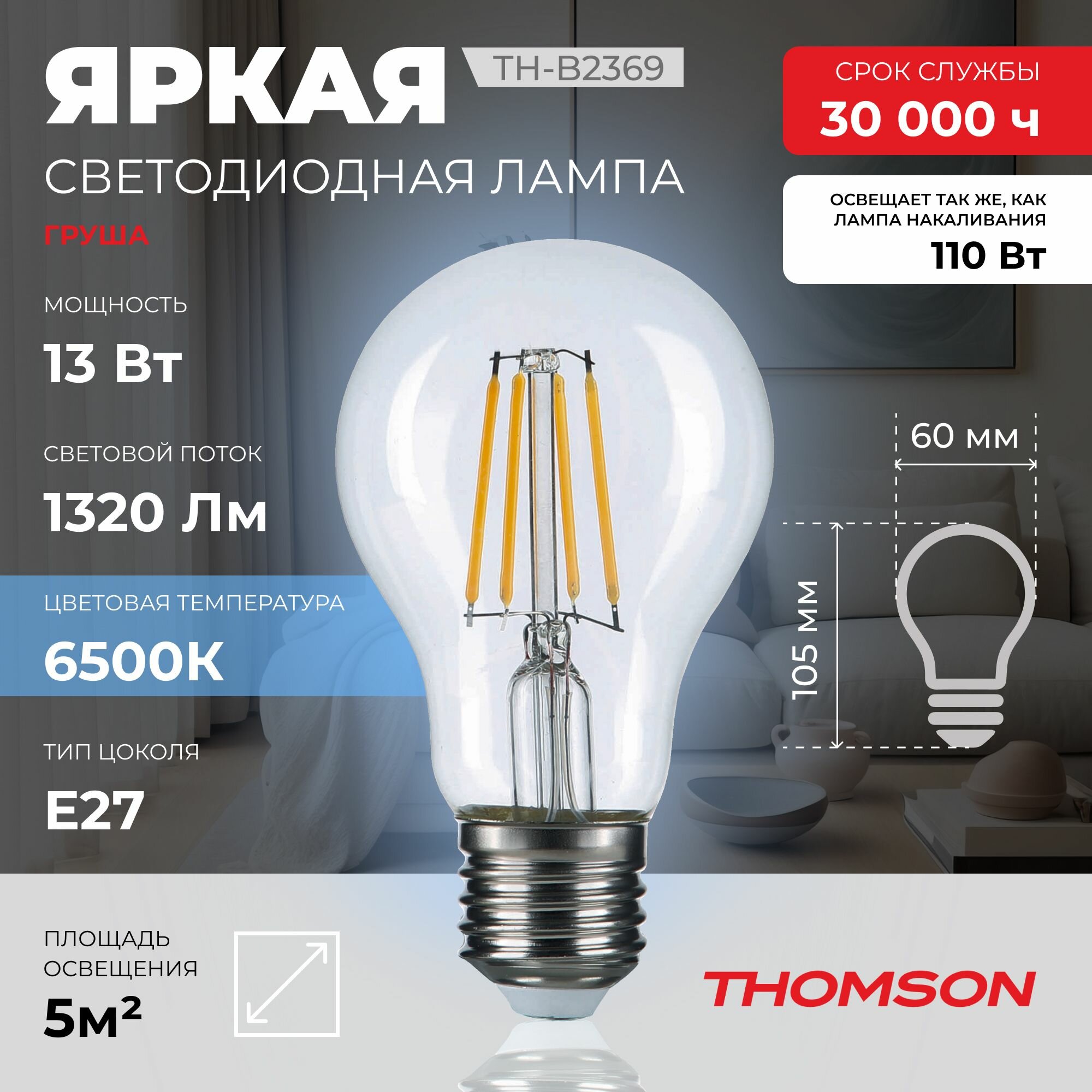 Отзывы на Лампочка Thomson филаментная TH-B2369 13 Вт, E27, 6500K, груша, холодный белый свет