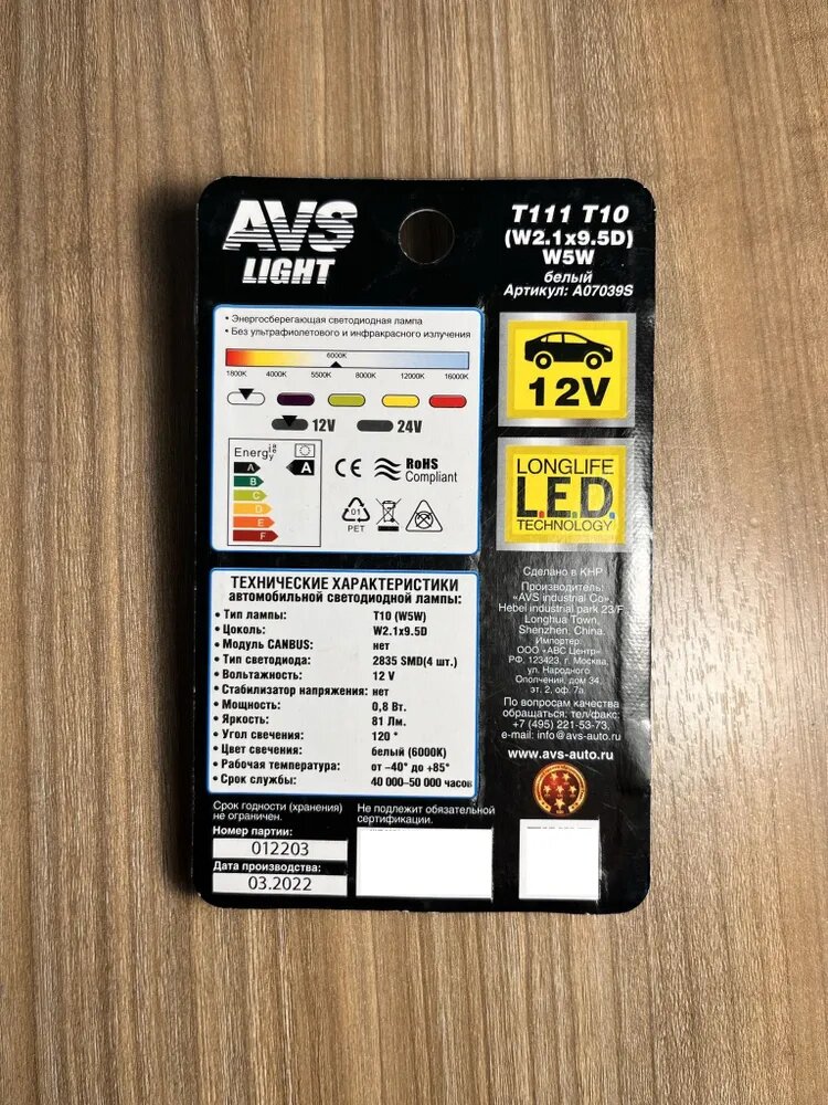 Лампа Светодиодная T111 T10/Белый/ (W2.1x9.5d) 4smd 2835 12v W5w, Блистер, 2 Шт. Avs A07039s AVS арт. A07039S