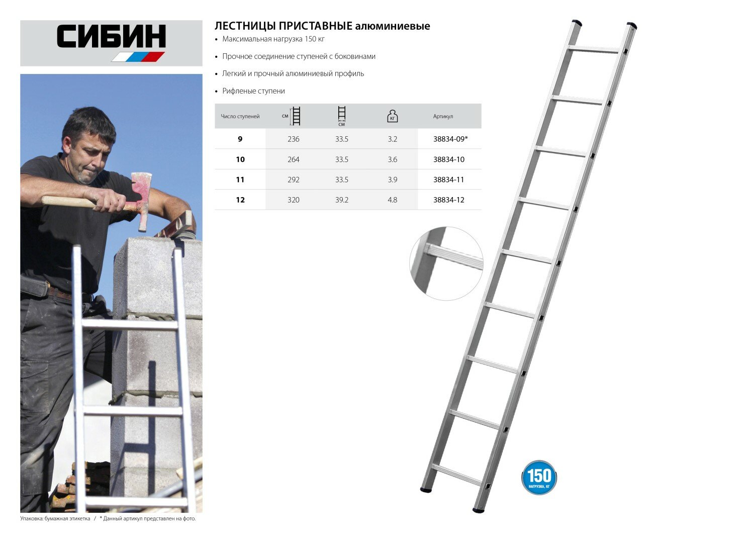 СИБИН 12 ступеней, высота 335 см, односекционная, алюминиевая, приставная лестница (38834-12) 9 100 ₽