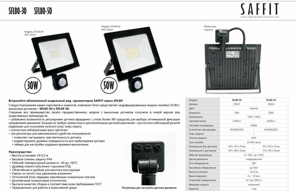 Прожектор светодиодный 50Вт холодный с датчиком движения Saffit SFL80 информация:
