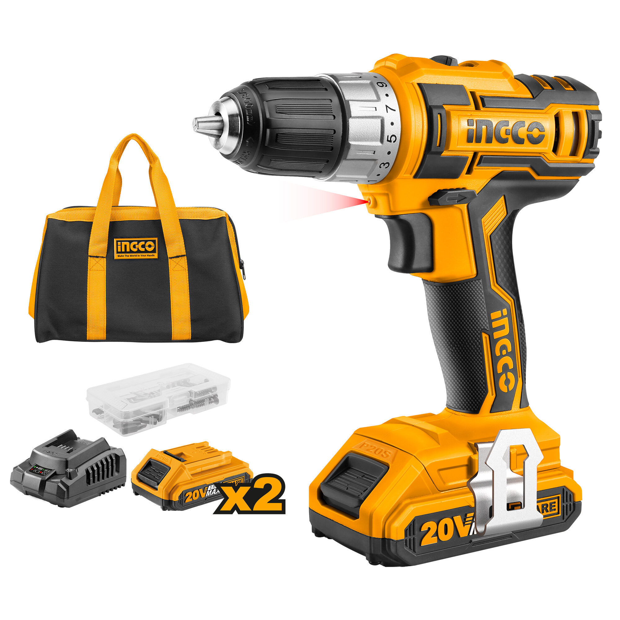 Шуруповерт INGCO Li-lon 20.0 В, 2 Ач, 45 Нм, 2 АКБ, патрон 10мм, сумка, CDLI2002 18 369 ₽