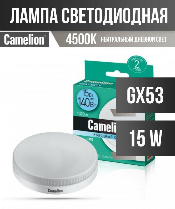 Лампа CAMELION GX53 15Вт 4500K 1320Лм 220В LED15-GX53/845 13647, светодиодная, нейтральный белый