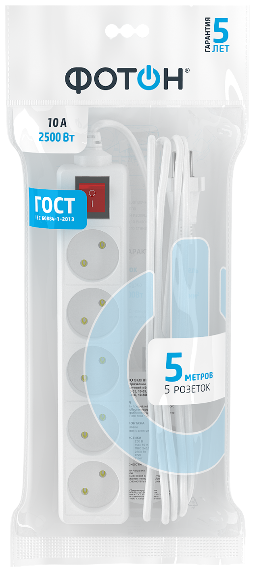 Удлинитель сетевой для розетки ФОТОН 10А 5м 5 розеток с выключателем белый, ГОСТ информация: