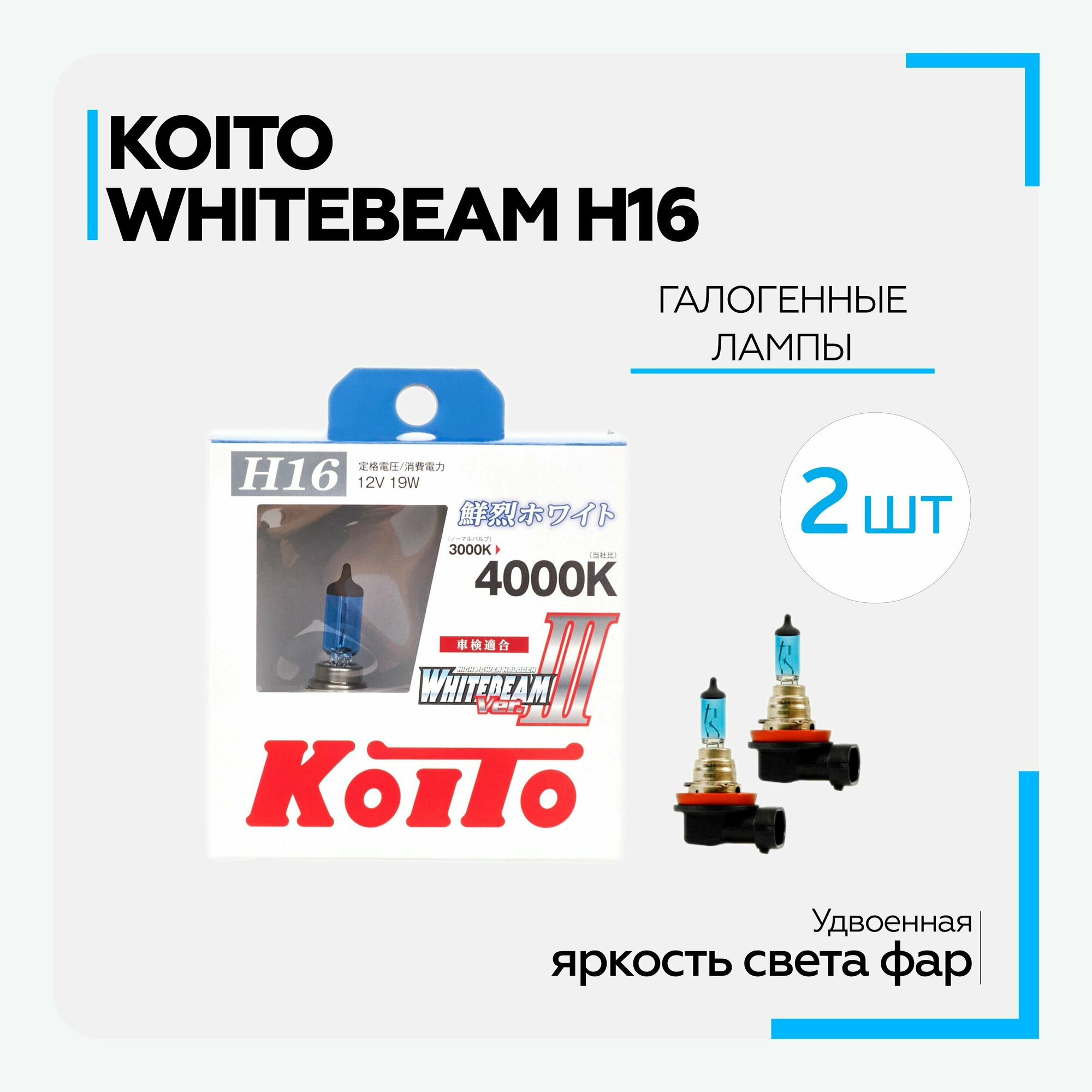 Комплект автомобильных ламп для фар "H16" KOITO WhiteBeam III, галогеновая, 12В, 19Вт, 4000К, 2 штуки информация: