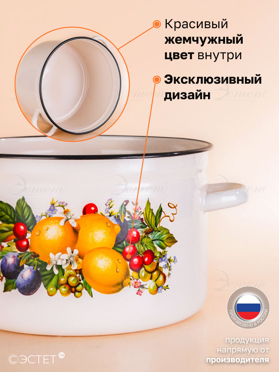 Кастрюля эмалированная 1,5 л с ободком белая с рисунком Фруктовая фантазия