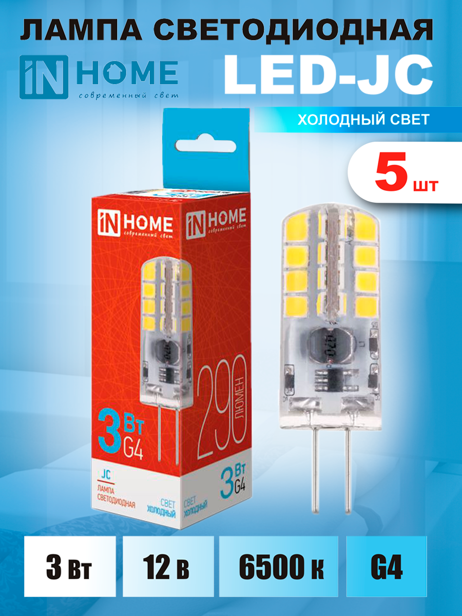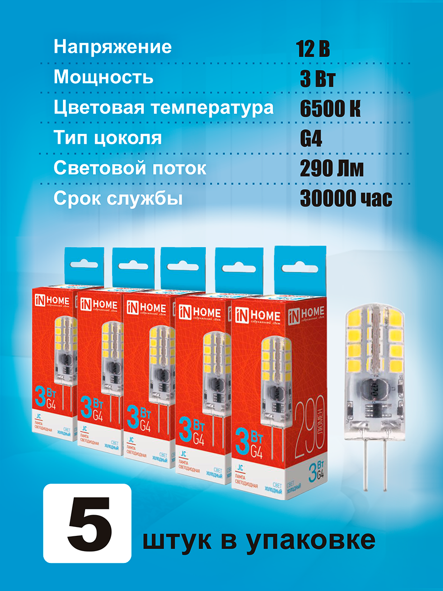 Лампа светодиодная LED-JC 3Вт 12В G4 6500К 290Лм IN HOME 5 шт информация: