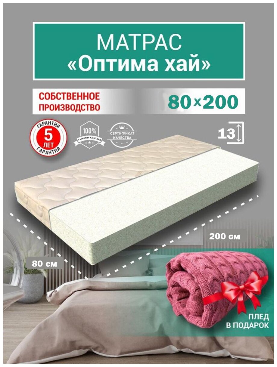 Матрас Оптима Хай, Беспружинный, 160х200 см ортопедический 160 на 200 высота 13 см, 160 х 200 х 13, чехол комплекте, плед в комплекте 11 280 ₽