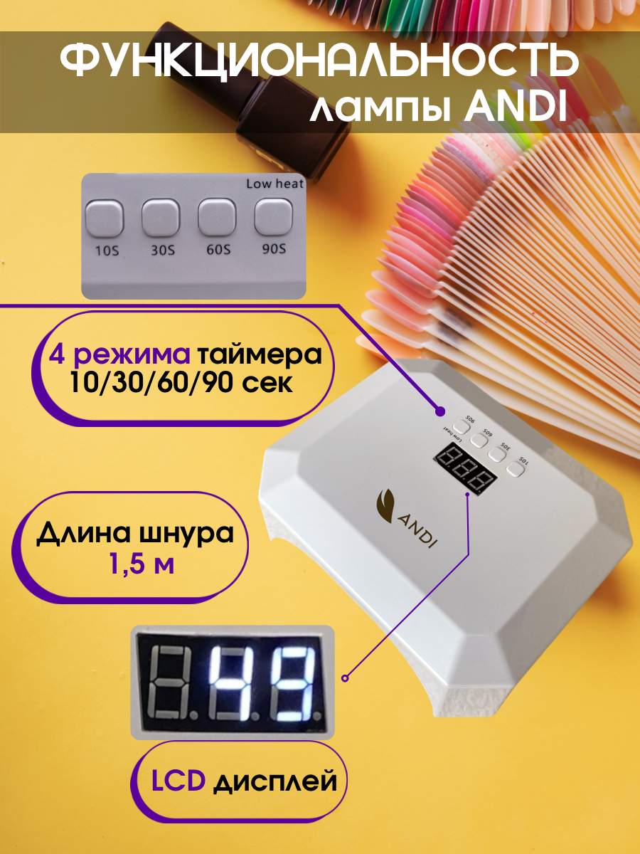 ANDI Лампа маникюрная для сушки ногтей Powerful X5 58W с дисплеем и таймером, Белая информация: