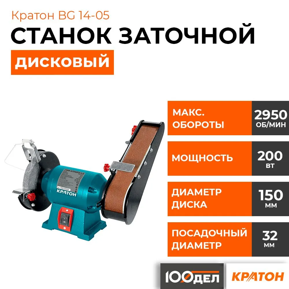 Станок заточной Кратон BG 14-05( оригинал) , электроточило (200 Вт, Размеры шлифовального круга 150х20х32 мм, Ленточно-шлифовальный узел)