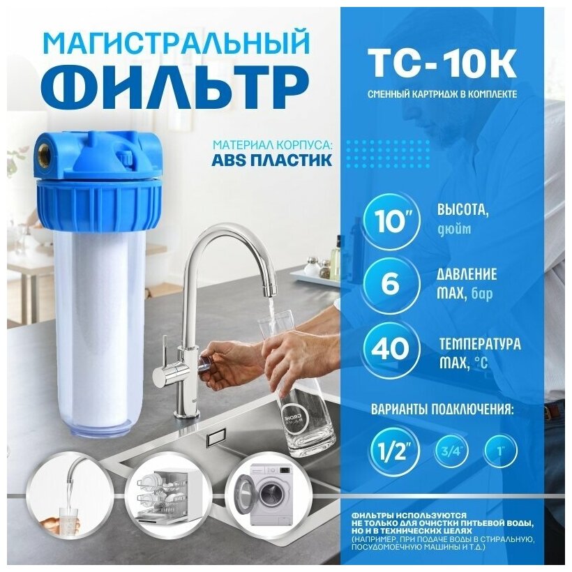 Фильтр для воды "Thermofix" (1/2" колба с гайкой, 10", с картриджем) + картридж (полипропиленовая нить,10 мкн) / фильтр для воды информация: