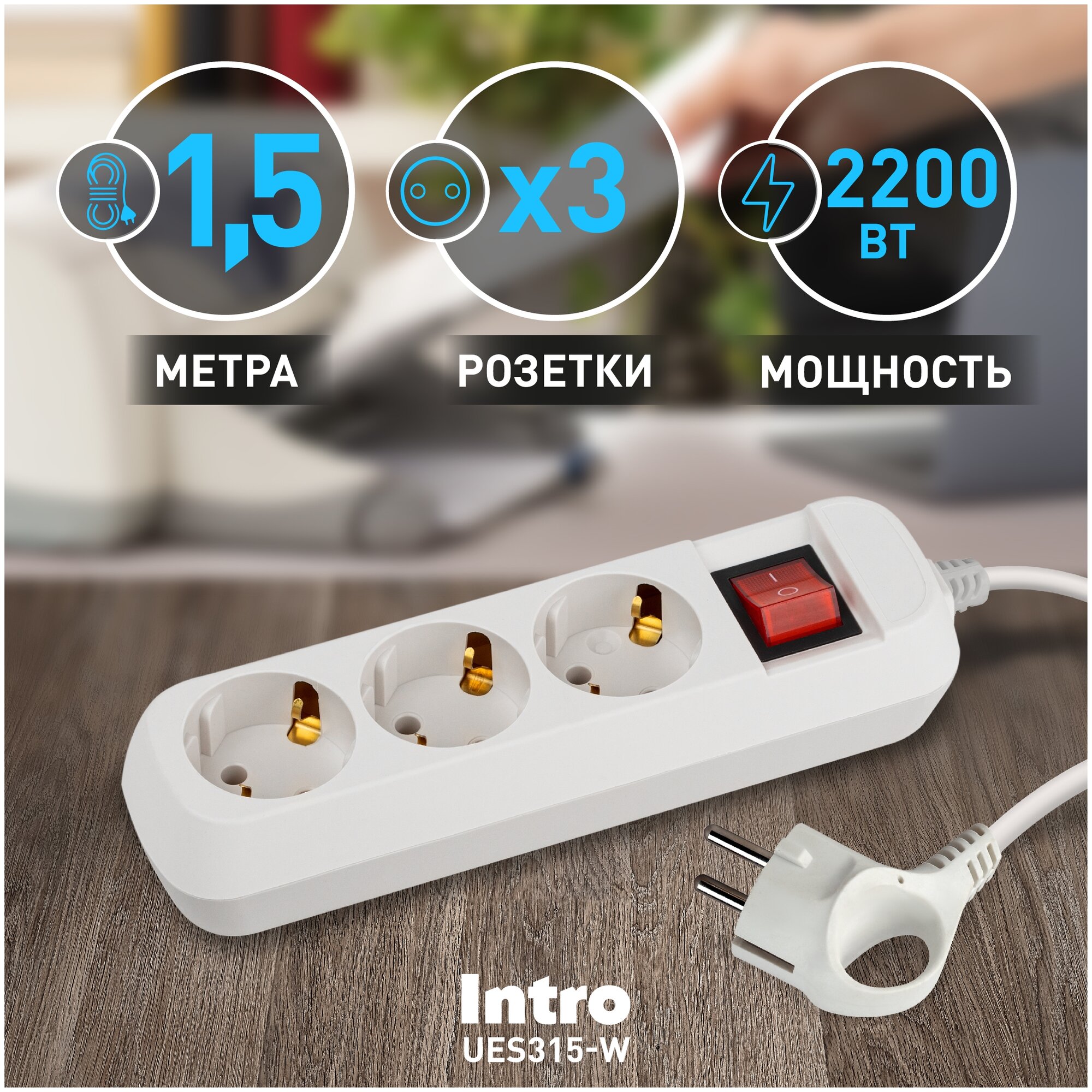 Отзывы на Удлинитель Intro UES315-W сетевой электрический бытовой с заземлением с выключателем 3 розетки, 1,5 м, ПВС 3х0,75мм2, 10А, белый