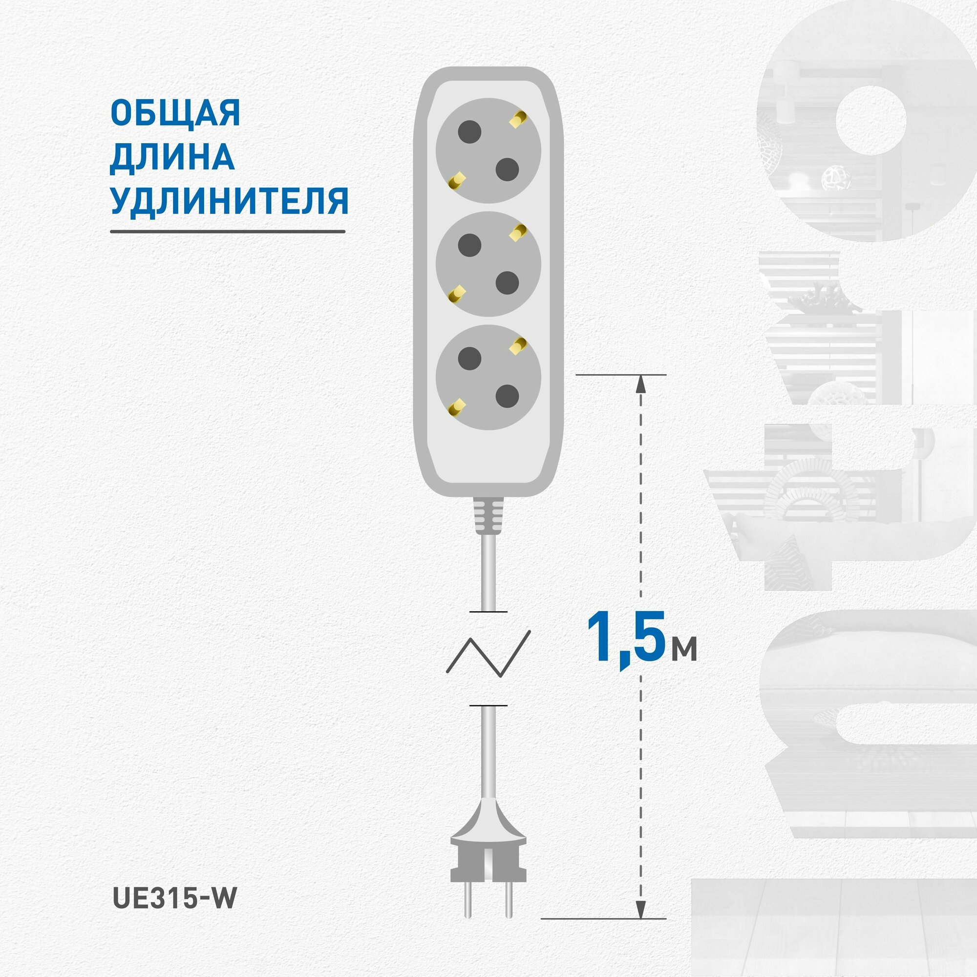 Удлинитель Intro UE315-W сетевой электрический бытовой с заземлением 3 розетки, 1,5 м, ПВС 3х0,75мм2, 10А, белый информация: