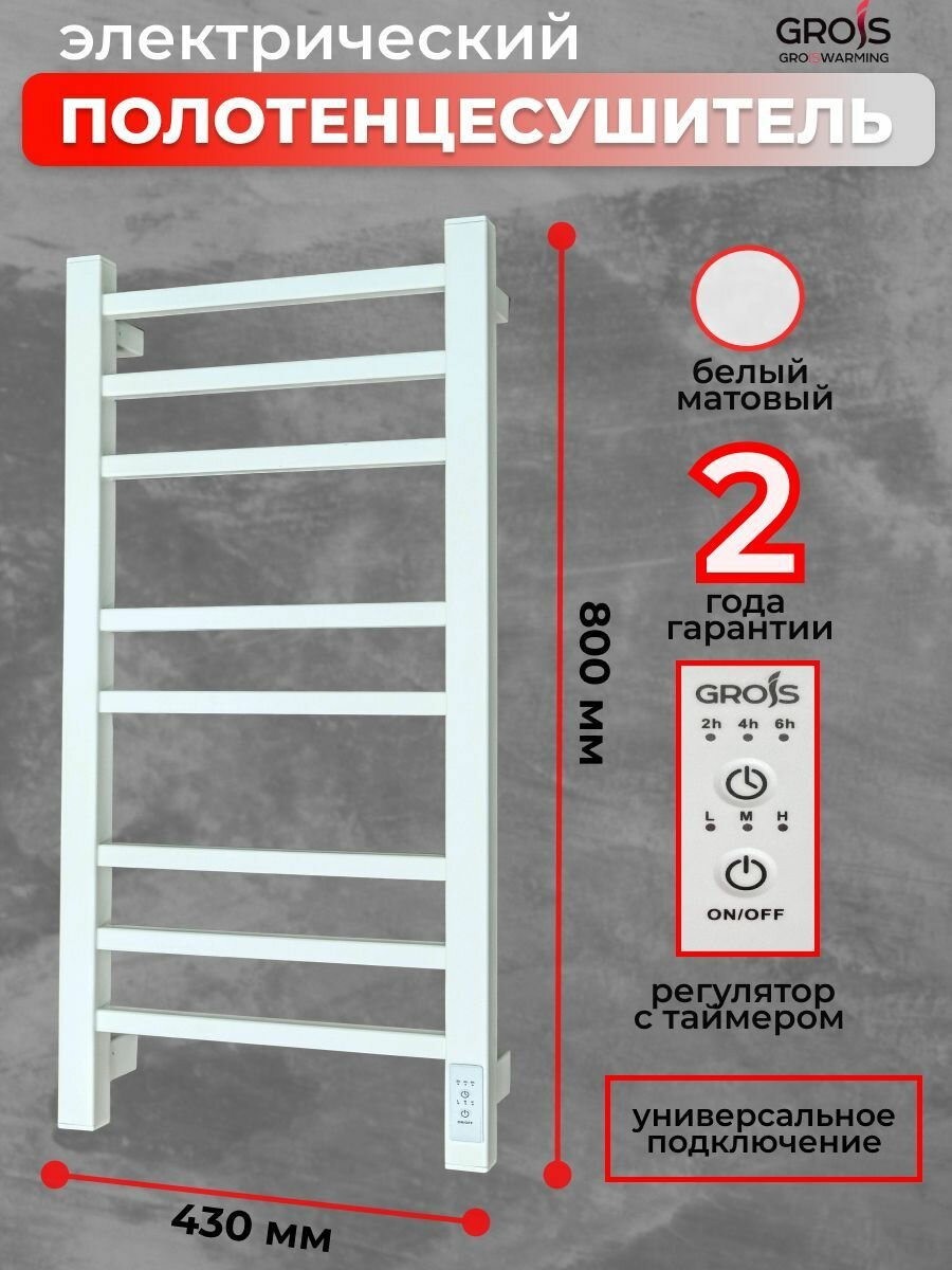 Полотенцесушитель электрический Grois Alex GR-102 400мм 800мм П8 белый матовый подключение универсальное форма Лесенка информация: