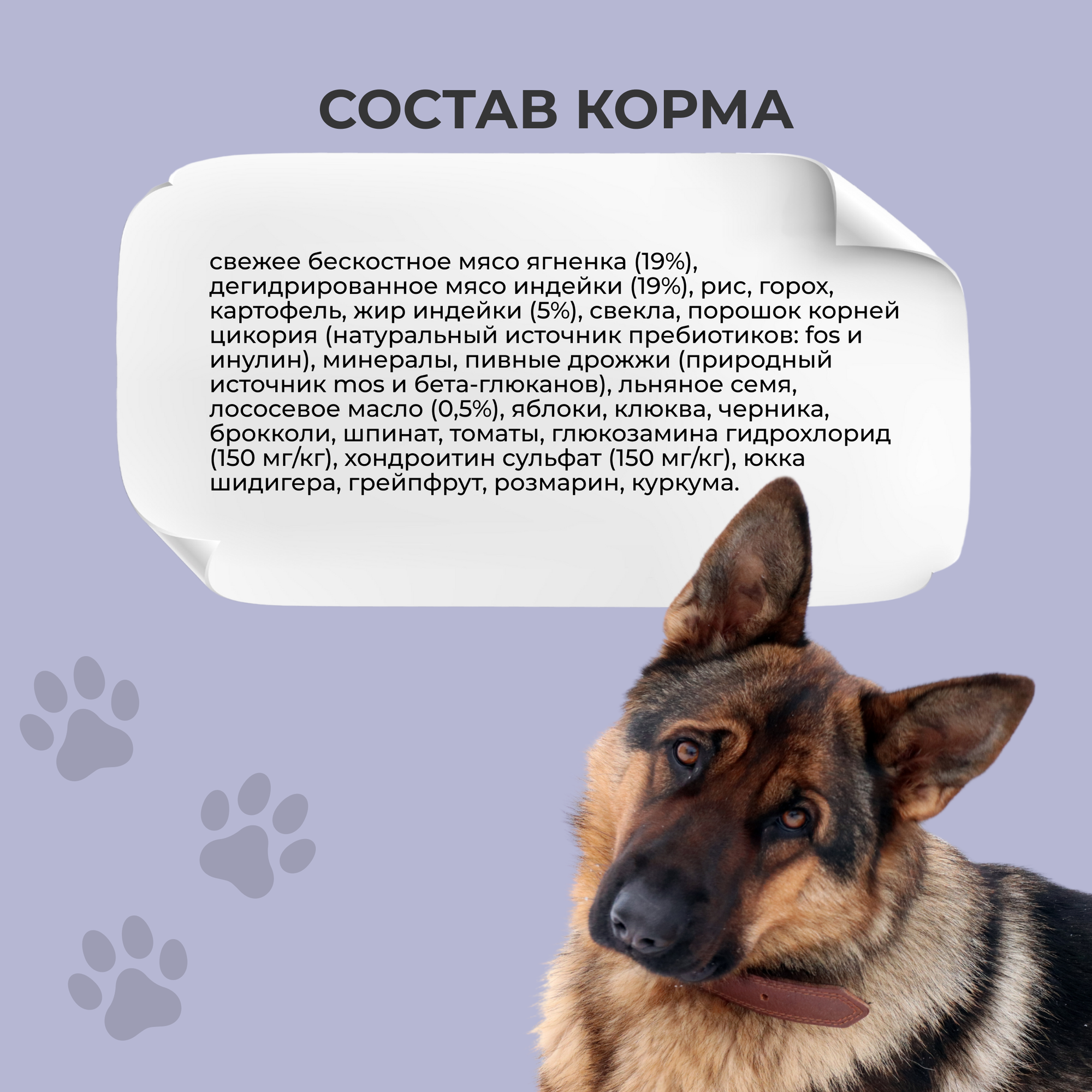| Состав | Свежее бескостное мясо ягненка (19%), дегидрированное мясо индейки (19%), рис, горох, картофель, жир индейки (5%), свекла, порошок корней цикория (натуральный источник пребиотиков: FOS и инулин), минералы, пивные дрожжи (природный источник MOS и бета-глюканов), льняное семя, лососевое масло (0,5%), яблоки, клюква, черника, брокколи, шпинат, томаты, глюкозамина гидрохлорид (150 мг/кг), хондроитин сульфат (150 мг/кг), Юкка Шидигера, грейпфрут, розмарин, куркума. |