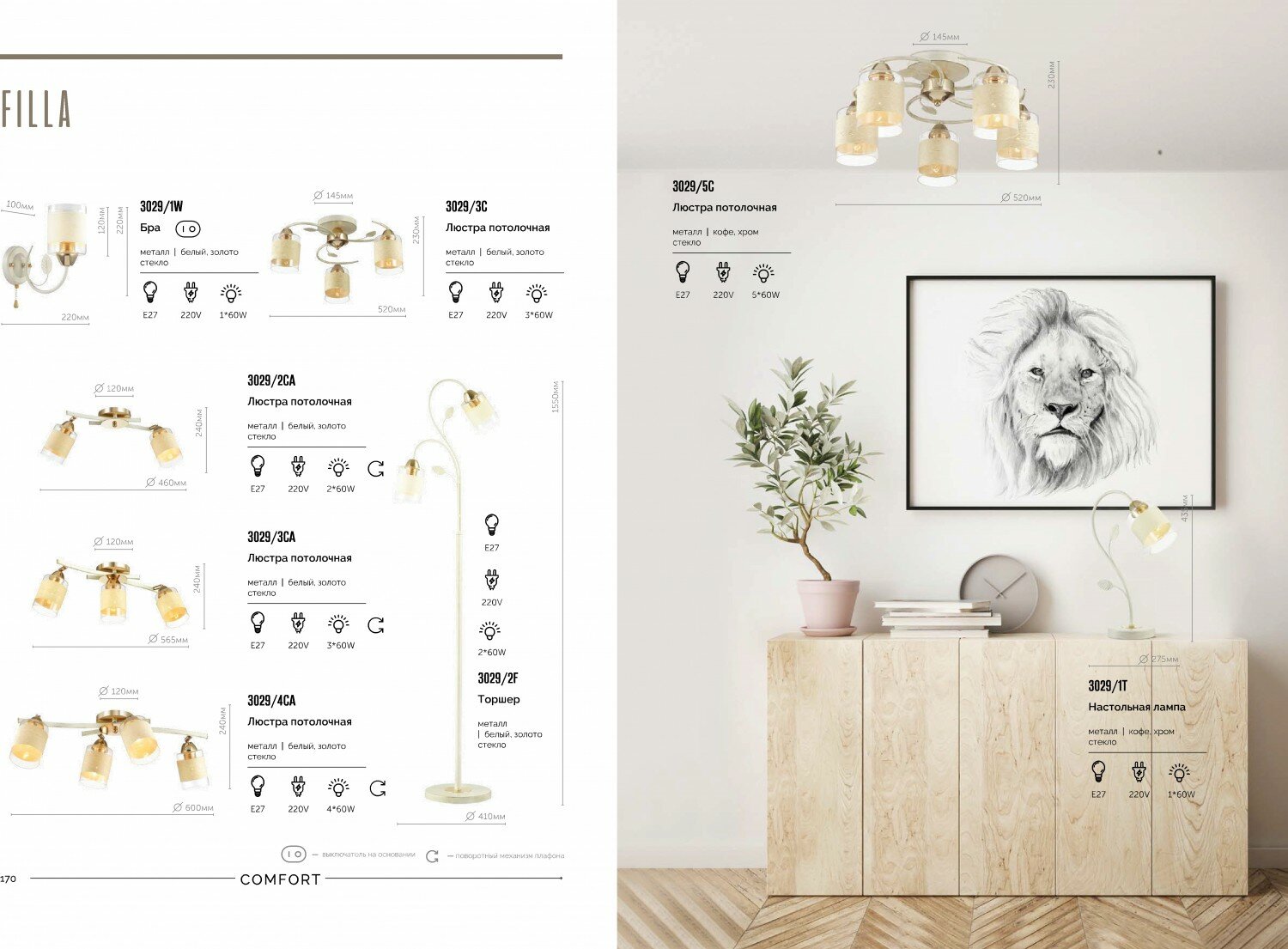 3029/1W COMFI LN16 204 золото, белый с золотой патиной Бра E27 60W 220V FILLA