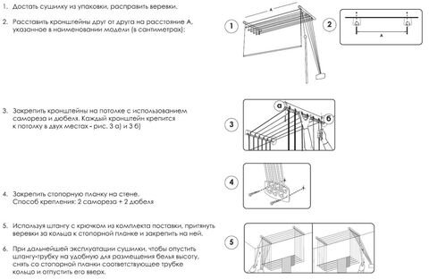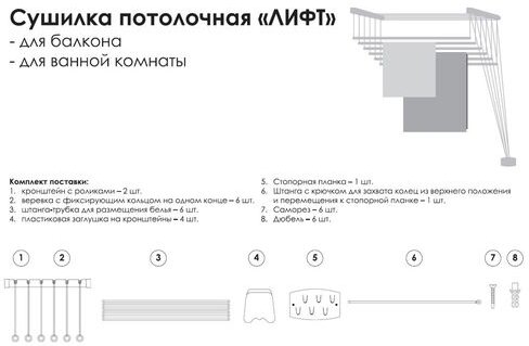 | Комплектация | кронштейн с роликами - 2 шт., веревка с фиксирующим кольцом на одном конце - 6 шт., штанга-трубка для размещения белья - 6 шт., пластиковая заглушка на кронштейны - 4 шт., стопорная планка - 1 шт., штанга с крючком для захвата колец из верхнего положения и перемещения к стопорной планке - 1 шт., саморез - 6 шт., дюбель - 6 шт |
