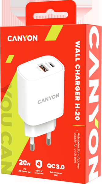 Сетевое зарядное устройство Canyon H-20-04, USB-C + USB-A, 3A, белый [cne-cha20w04]
