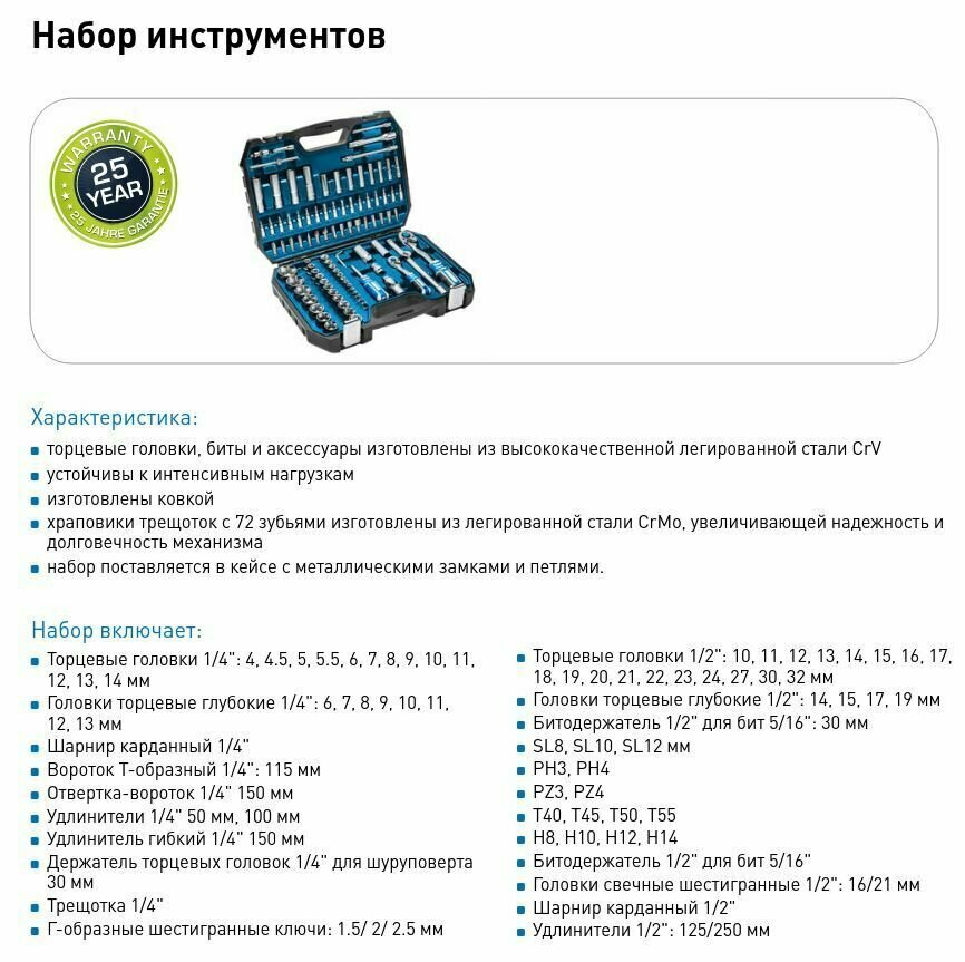 | Дополнительная информация | шарнир карданный 1/4", вороток Т-образный 1/4" 115 мм, отвертка-вороток 1/4" 150 мм, удлинители 1/4" 50 мм, 100 мм, удлинитель гибкий 1/4" 150 мм, держатель торцевых головок 1/4" для шуруповерта 30 мм, трещотка 1/4", битодержатель 1/2" для бит 5/16", шарнир карданный 1/2", удлинители 1/2": 125/250 мм |