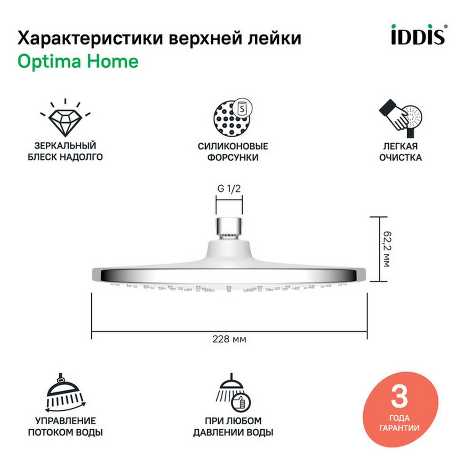 Верхний душ IDDIS Optima Home d228 мм, 1 режим, хром OPH22CRi64