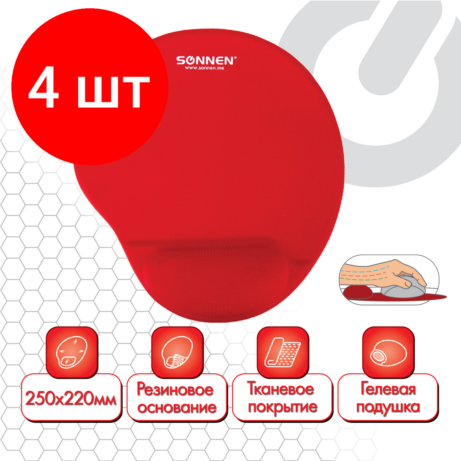 Комплект 4 шт, Коврик для мыши с подушкой под запястье SONNEN, полиуретан + лайкра, 250х220х20 мм, красный, 513301 информация: