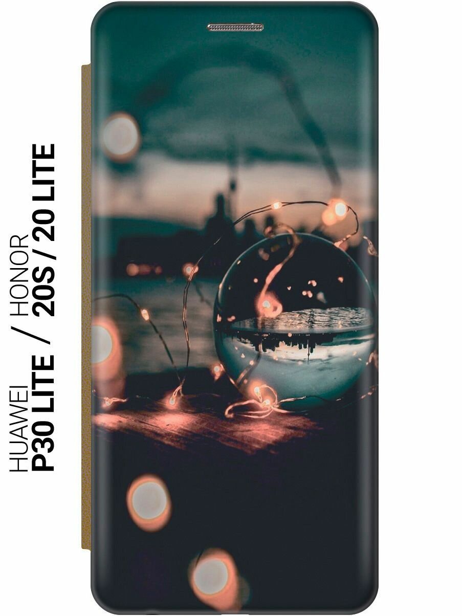 Чехол-книжка на Honor 20 Lite, 20s, Huawei P30 Lite, Хуавей П30 Лайт, Хонор 20 Лайт, 20s c принтом "Гирлянда в лампочке" золотистый 807 ₽