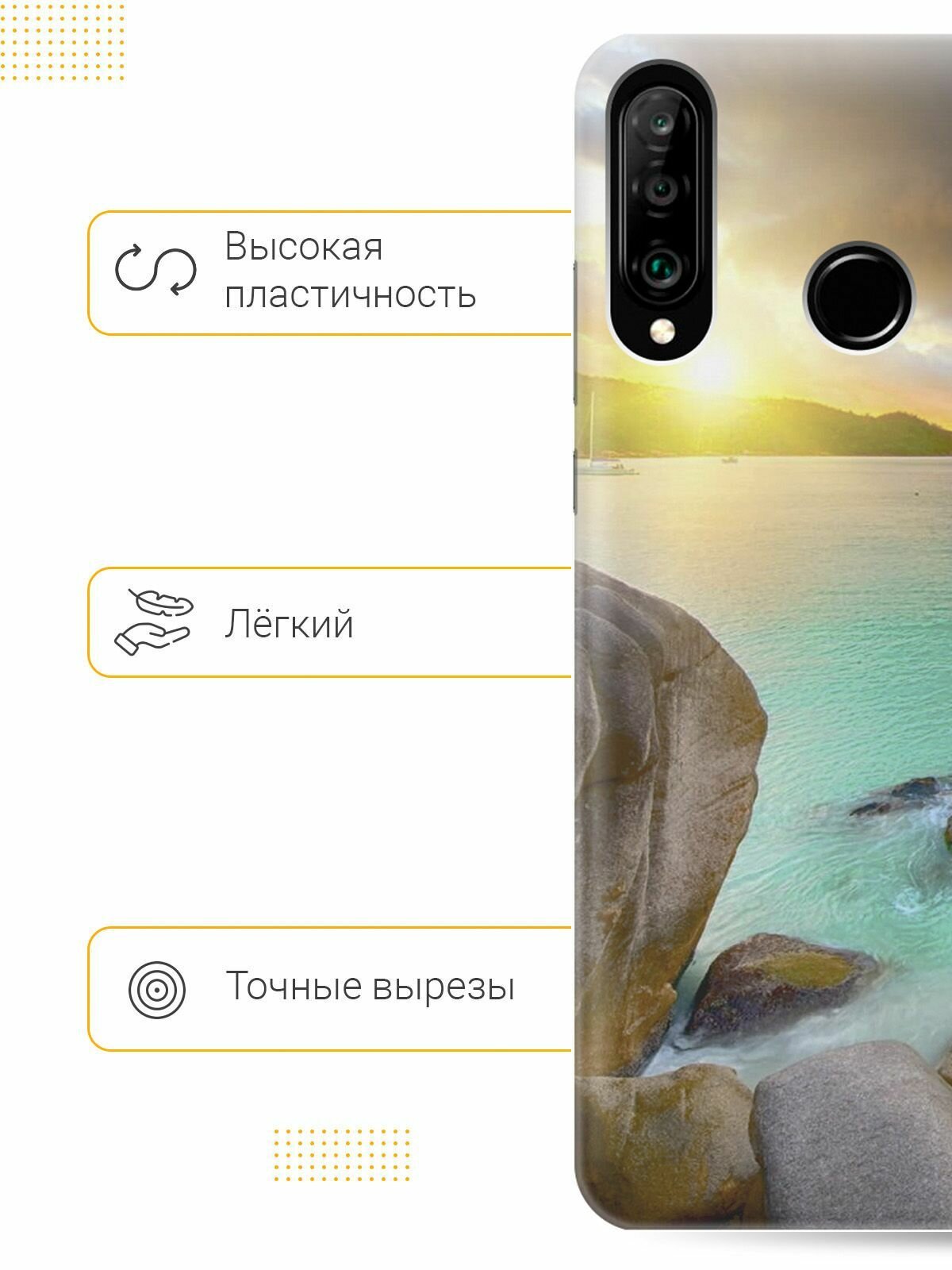 Отзывы на Силиконовый чехол на Honor 20 Lite, 20s, Huawei P30 Lite, Хуавей П30 Лайт, Хонор 20 Лайт, 20s с принтом "Закат на каменистом берегу"