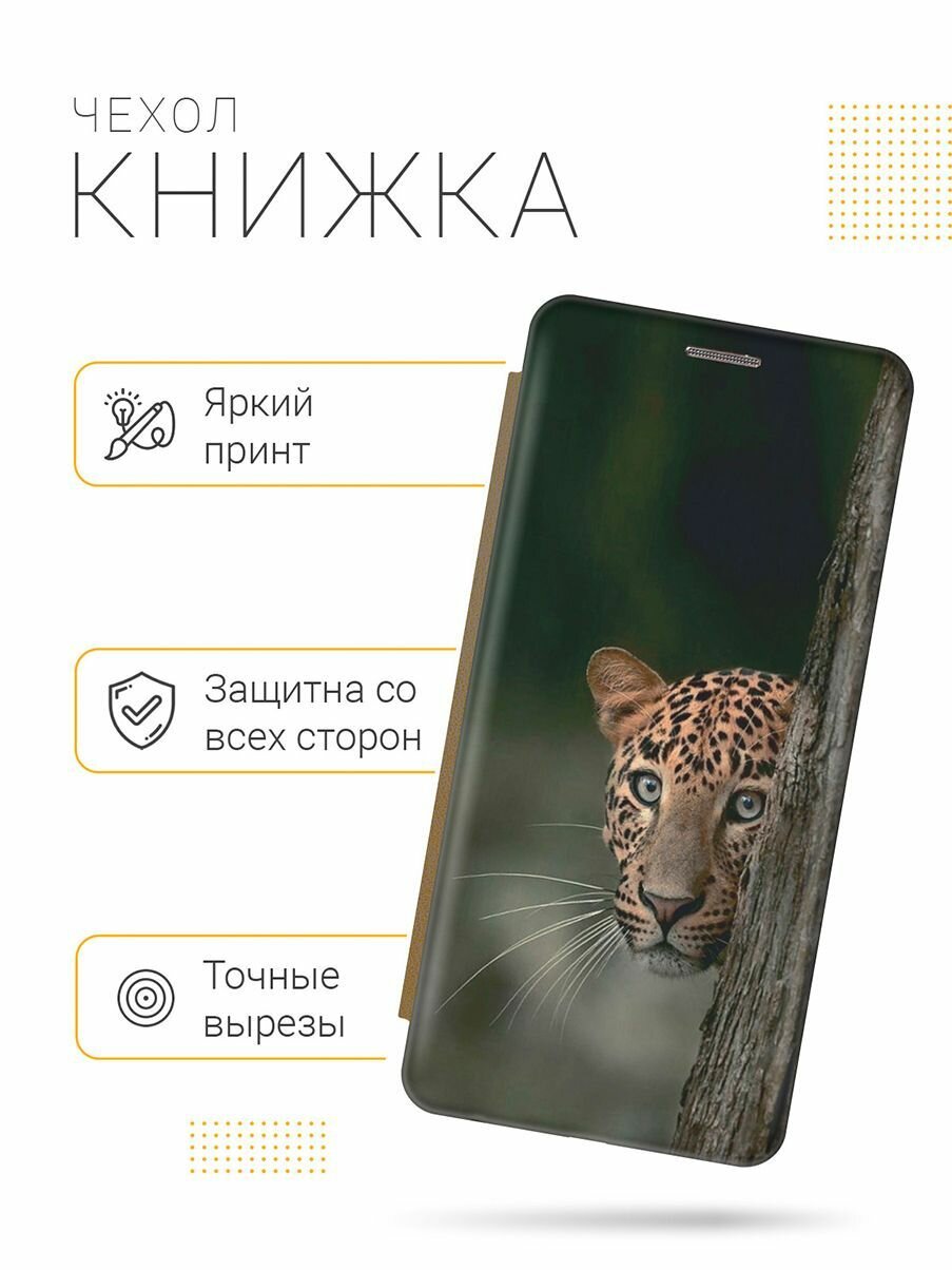Отзывы на Чехол-книжка на Honor 20 Lite, 20s, Huawei P30 Lite, Хуавей П30 Лайт, Хонор 20 Лайт, 20s c принтом "Подглядывающий леопард" золотистый