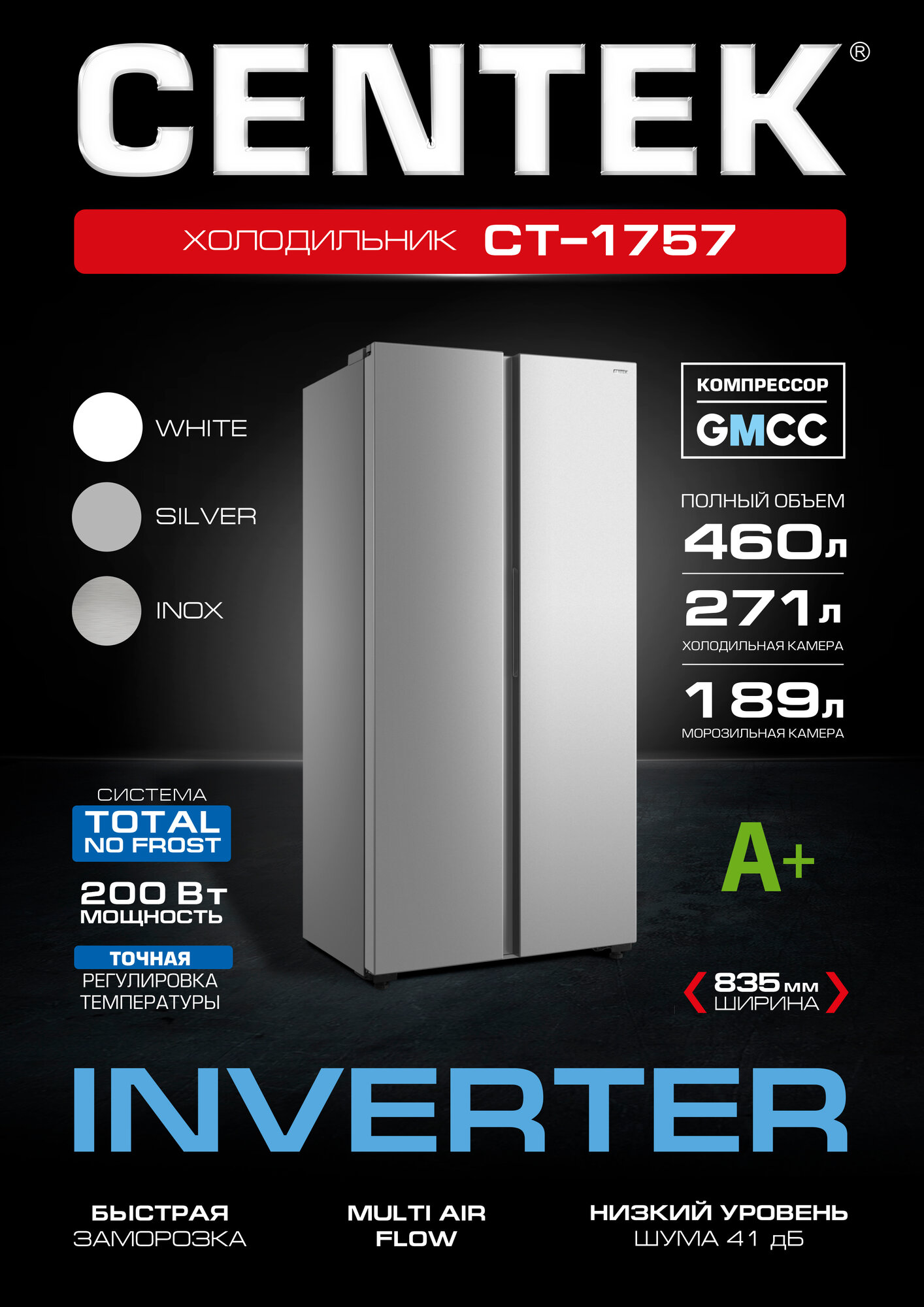 Холодильник CENTEKCT-1757 NF INOX - INVERTER, Side-by-Side, 460л (189л/271л), A+, GMCC, двухдверный 69 299 ₽