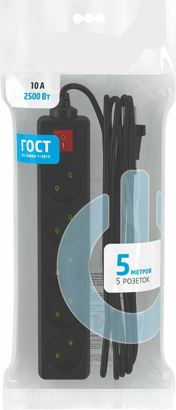 10 цен на Удлинитель сетевой фотон 10-55S, 5м, 5 розеток, 10А, с выкл., Черный