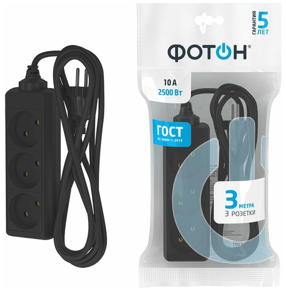 Фотон Удлинитель сетевой 10-33, 3м, 3 розетки, 10А, с выключателем, Черный 22719 информация:
