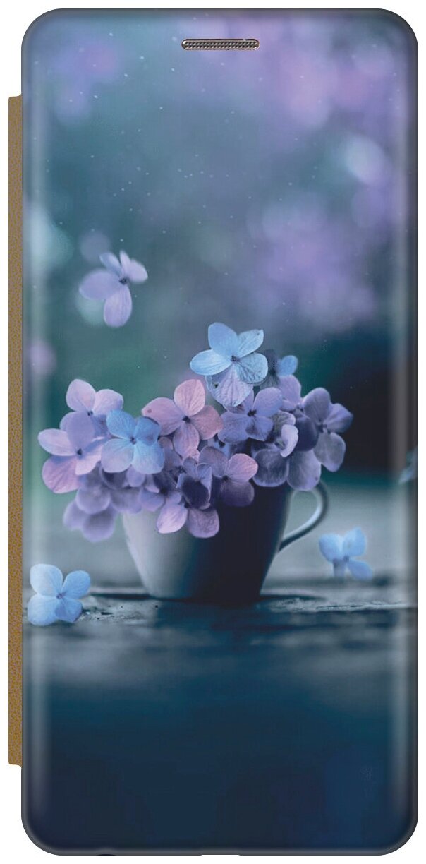 Чехол-книжка на Apple iPhone SE / 5s / 5 / Эпл Айфон 5 / 5с / СЕ с рисунком "Синие цветы в чашке" золотой информация: