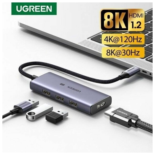 Хаб (разветвитель) Ugreen 4 в 1, 3 х USB 3.0, HDMI 4Кх120Гц