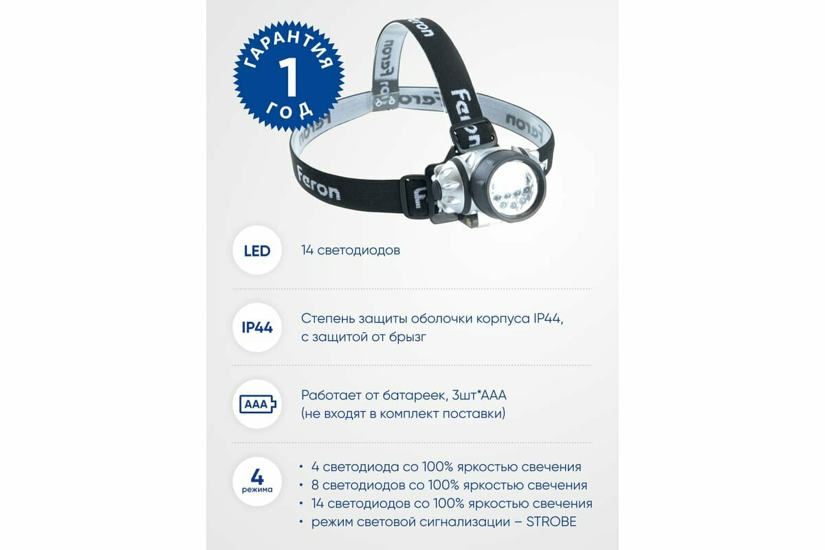 Фонарь налобный FERON TH2304 на батарейках 3*AAA, 3W 14LEDs IP44 пластик, 41708 информация: