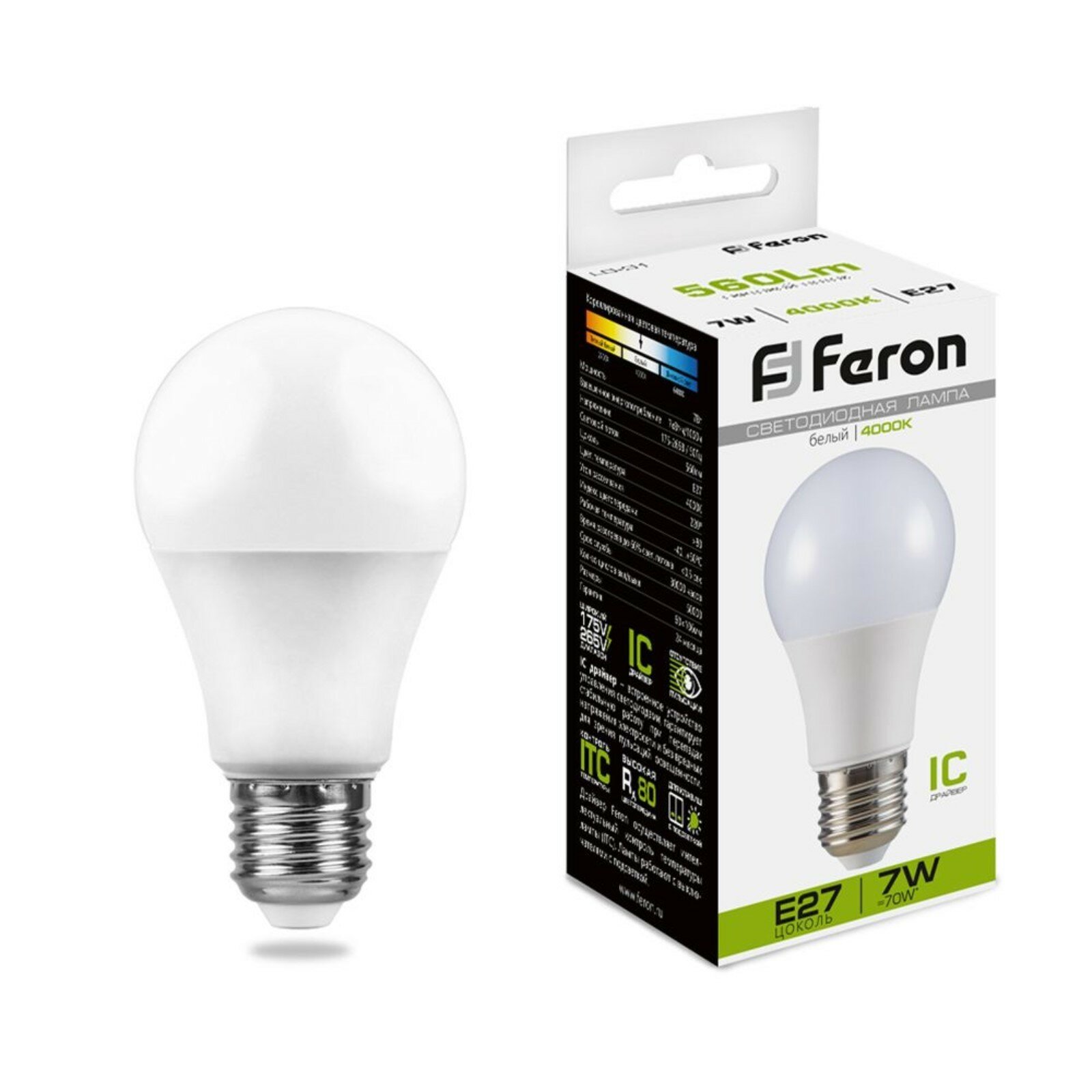 Лампа светодиодная, (7W) 230V E27 4000K A60, LB-91 арт. 25445 информация: