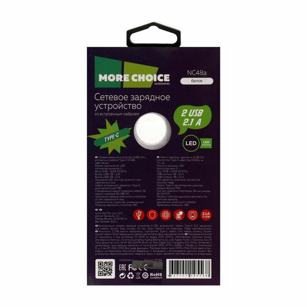 Сетевое зарядное устройство More choice 2USB 2.4A для Type-C NC48a (White) 590 ₽