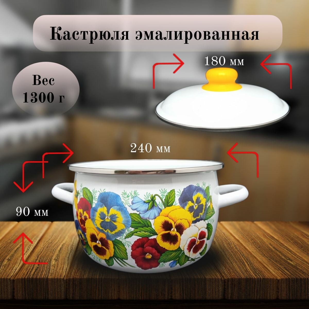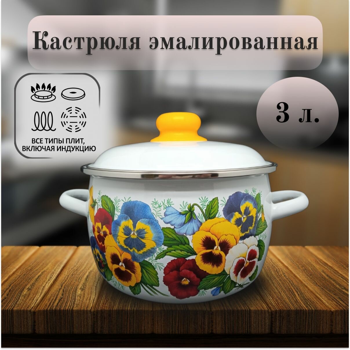 Кастрюля, Эмаль, 3 л, Анютины глазки, СтальЭмаль информация: