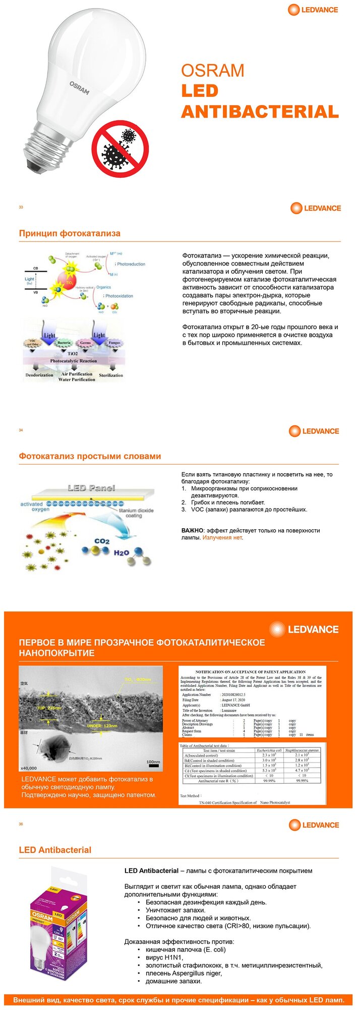 Лампа Светодиодная Антибактериальная Груша 13W 220-240V E27 1521Лм 6500К Угол 200 град. D-60mm L-118mm Свет Холодный белый OSRAM, уп. 10шт