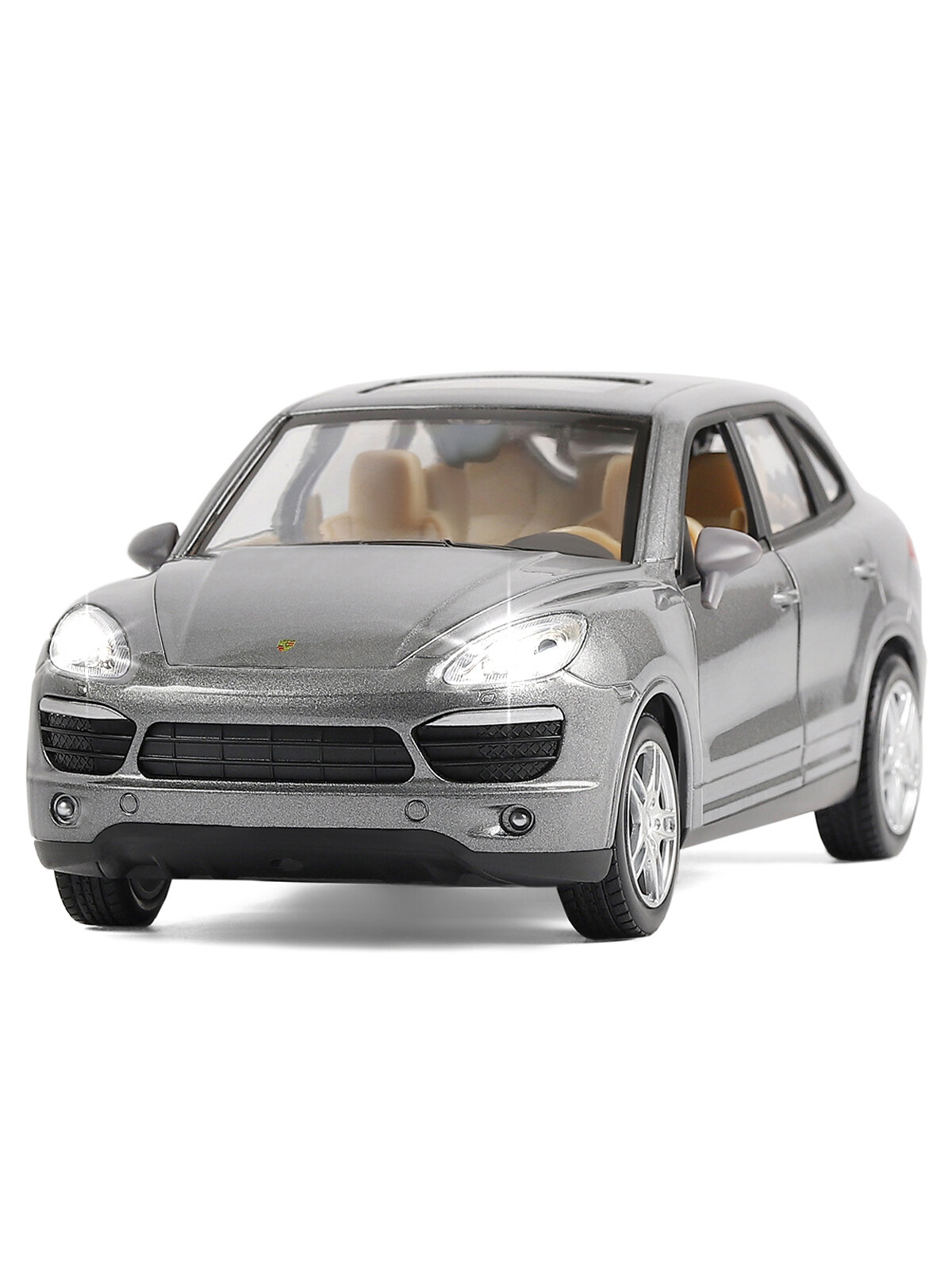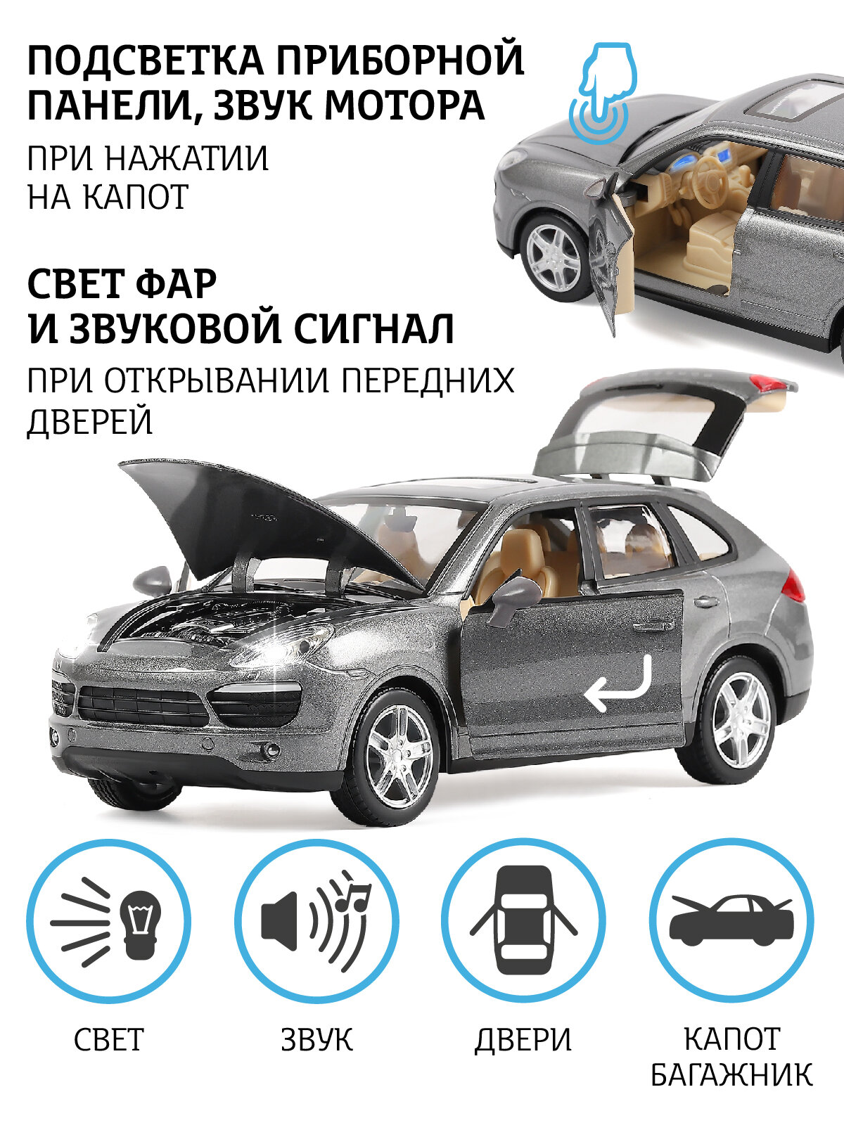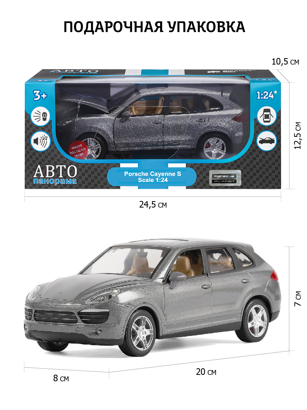 Модель машины Автопанорама 1:24 Porsche Cayenne S, серый, свободный ход колес, открываются двери, капот и багажник, свет, звук (JB1200119)