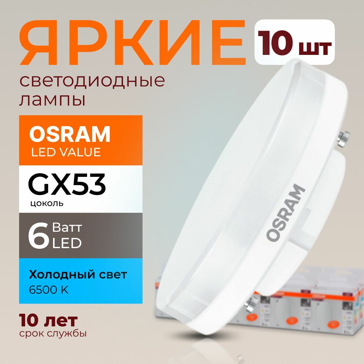 10 цен на Лампа светодиодная OSRAM 6W=50W 220V Таблетка GX53 480Лм 6500К Холодный белый, уп. 10шт