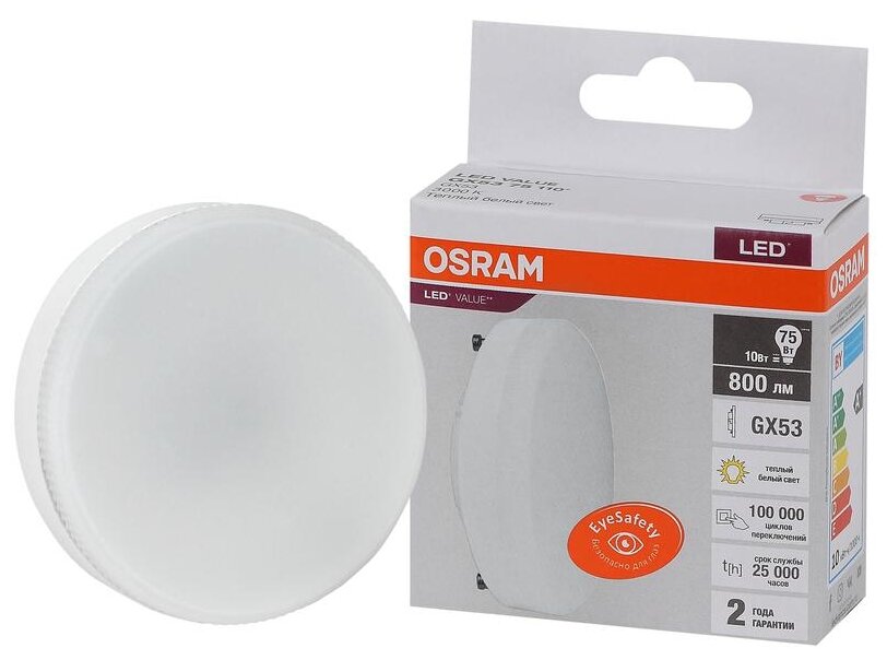 Отзывы на Лампа светодиодная OSRAM 10W=75W 220V Таблетка GX53 800Лм 3000К Теплый белый, уп. 10шт