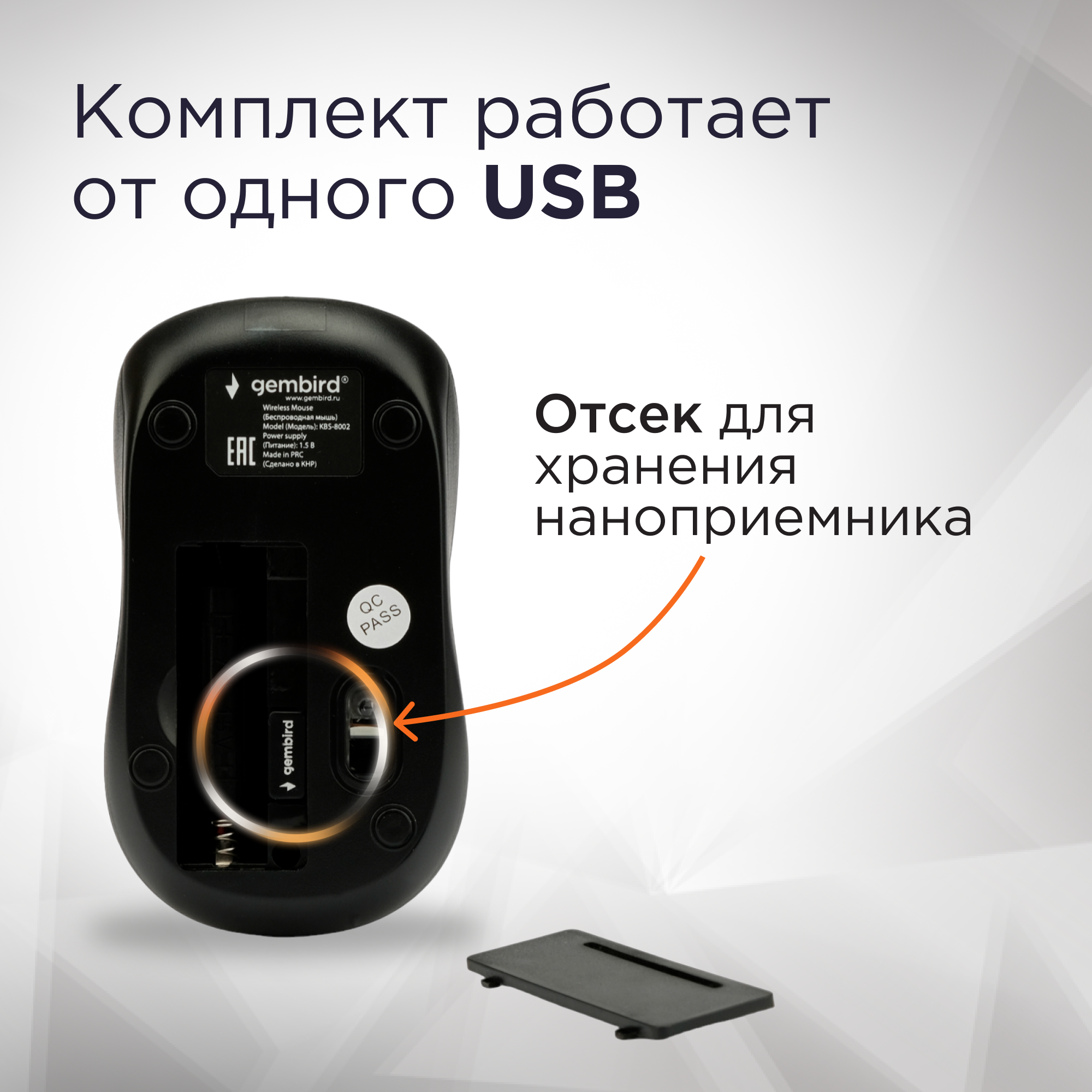 Набор беспроводной GEMBIRD KBS-8002, клавиатура, мышь 2 кнопки + 1 колесо-кнопка, черный 1 160 ₽