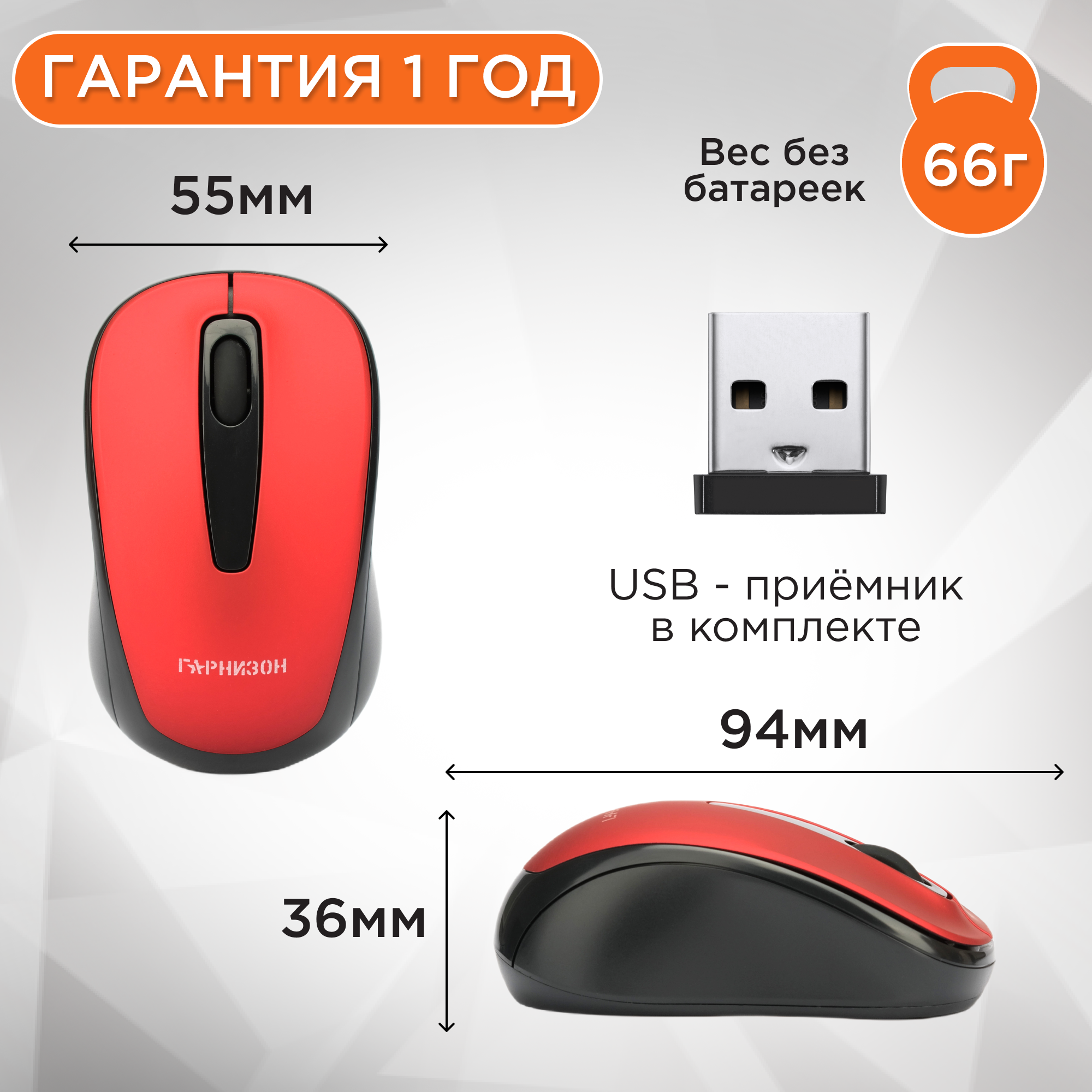 Гарнизон Мышь "Гарнизон" GMW-450-4, беспроводная, оптическая, 1000 DPI, USB, красная