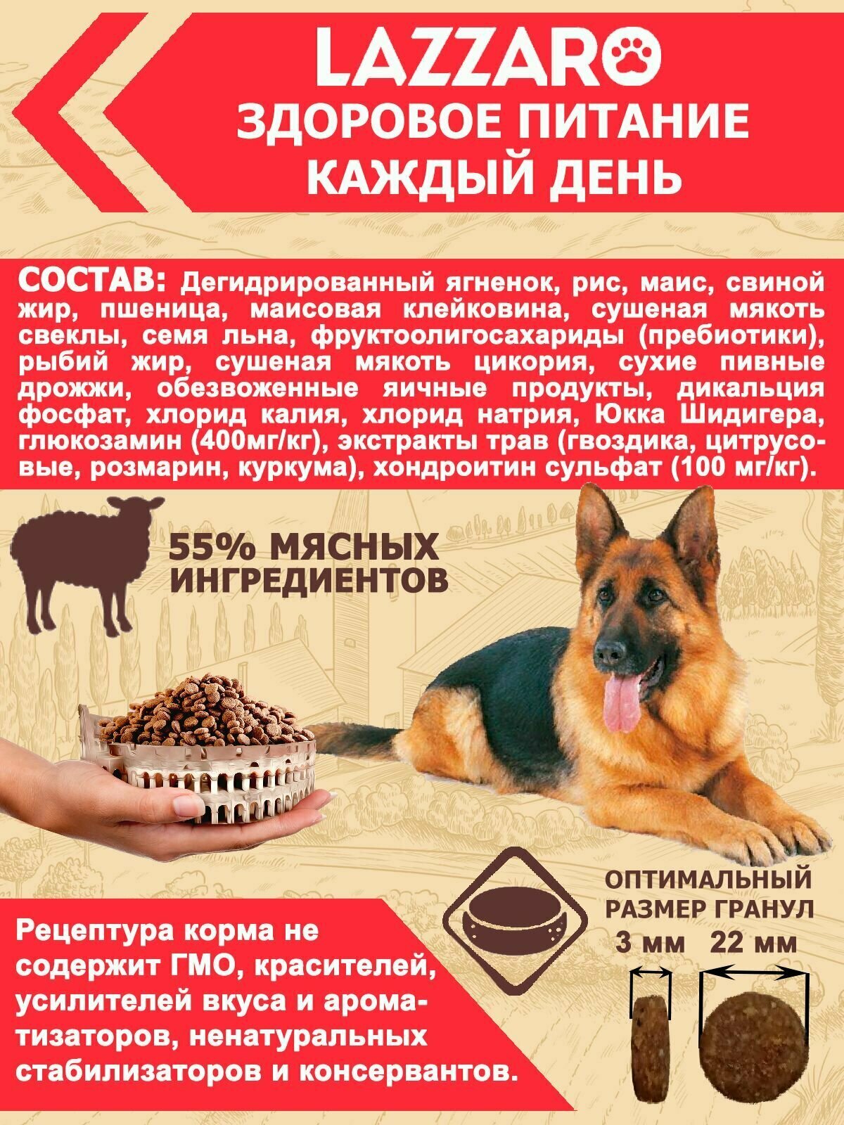 Корм LAZZARO сухой полнорационный с Ягненком и рисом для собак крупных пород 3 кг информация: