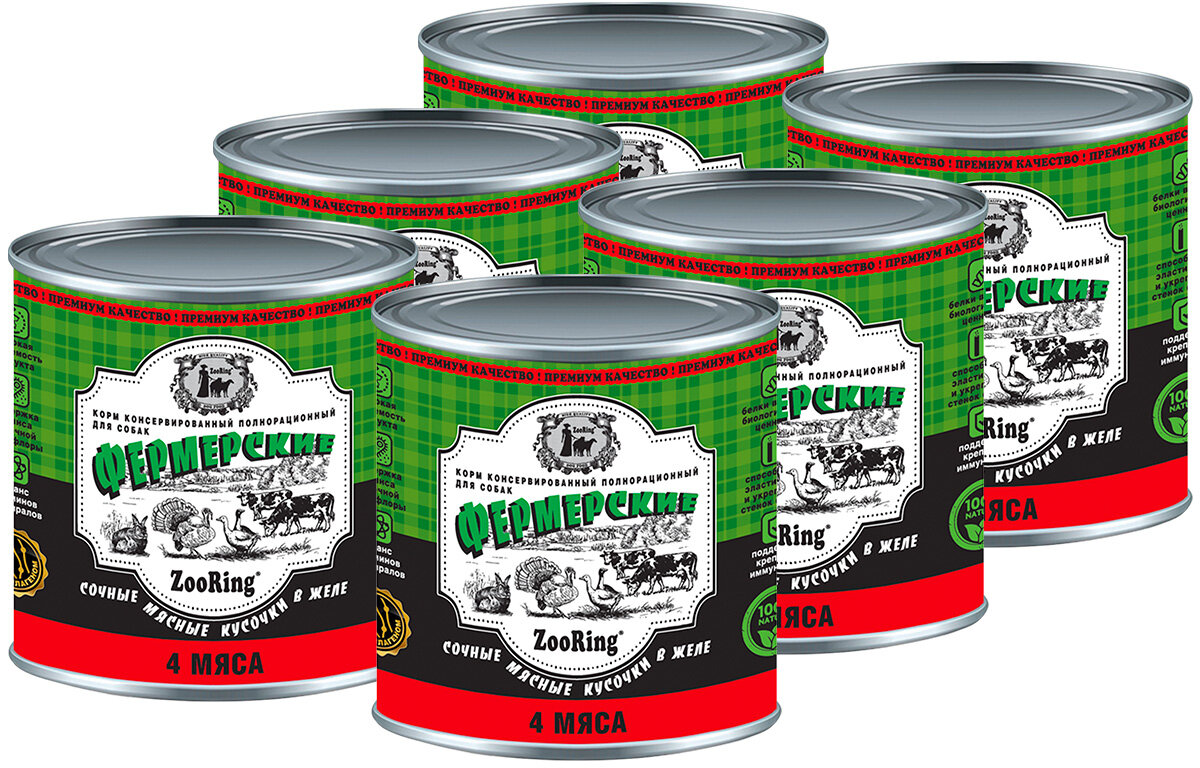 ZOORING фермерские для взрослых собак кусочки 4 мяса в желе банка (850 гр х 6 шт) информация: