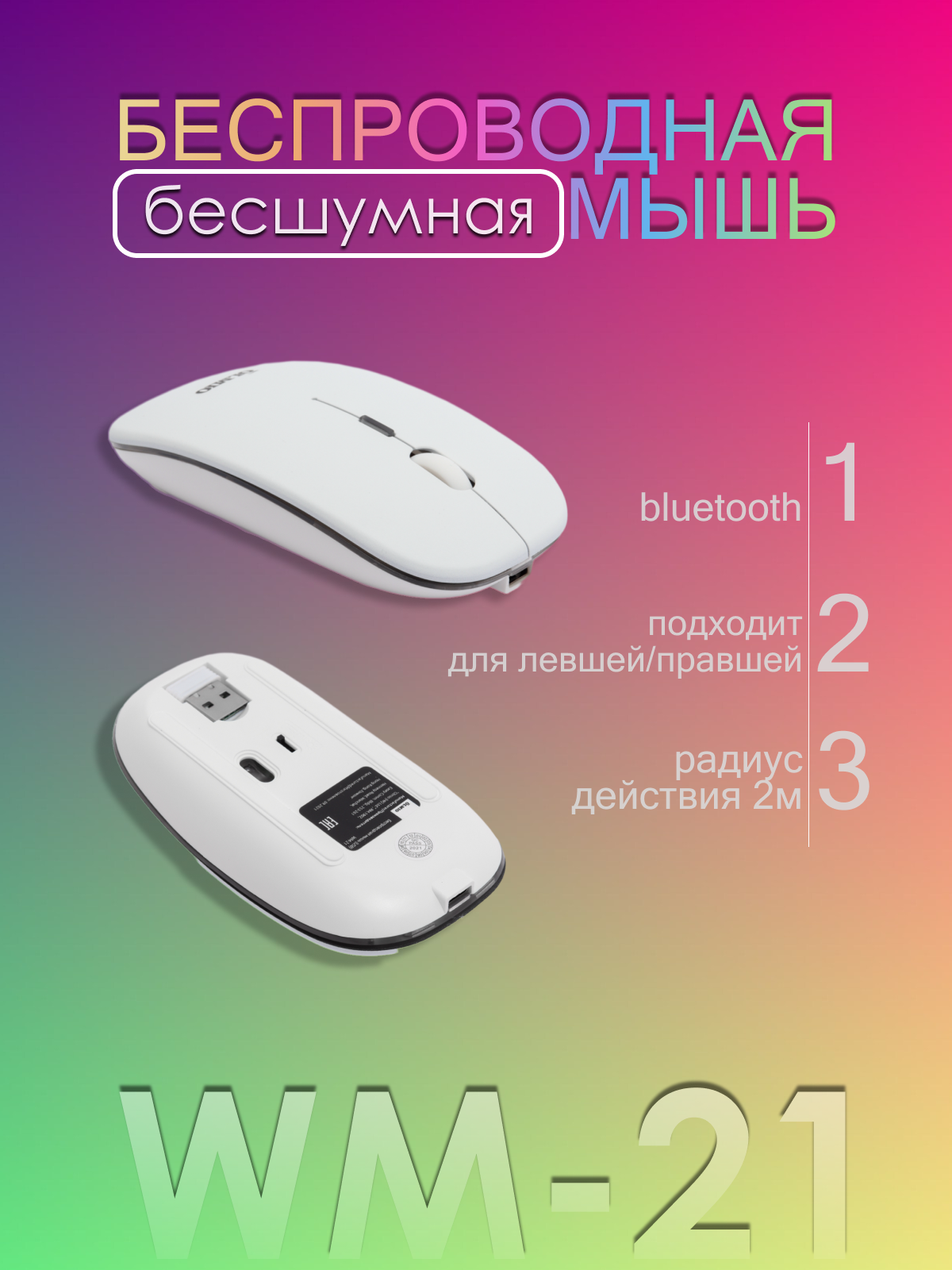 Компьютерная беспроводная тихая мышь с цветной подстветкой RGB WM-21 / 4 кнопки / разрешение 1600 DPI / белая
