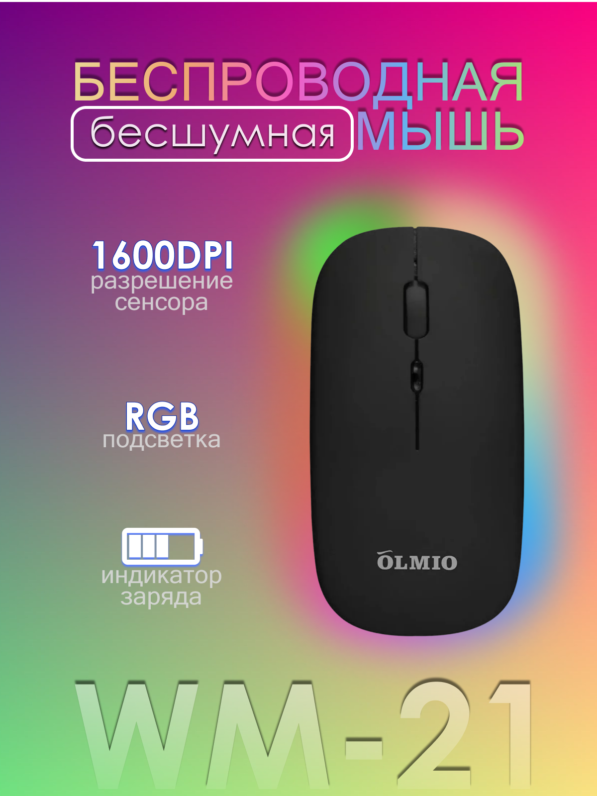 Компьютерная мышь Olmio WM-21, RGB подсветка, 1600 DPI, тихая, черная 879 ₽
