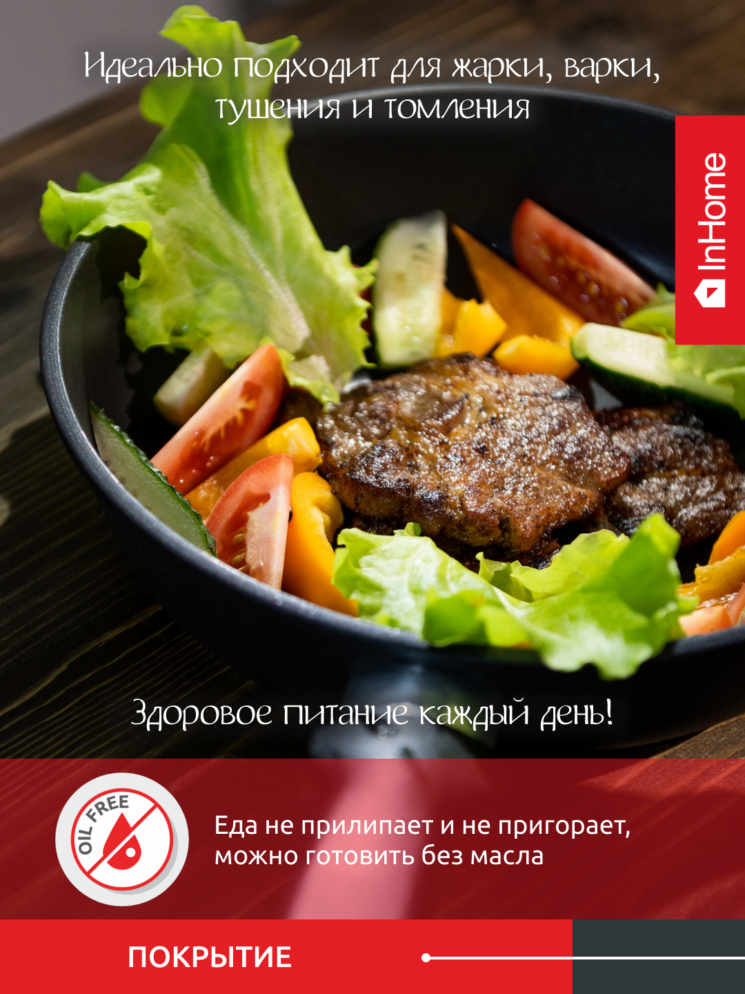 Сковорода InHome классическая литая толстостенная с антипригарным покрытием, съемная ручка